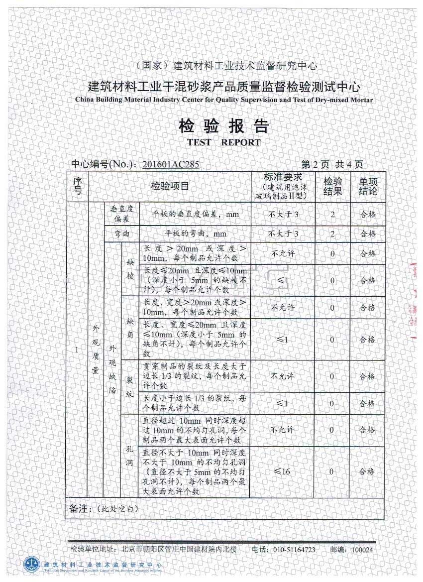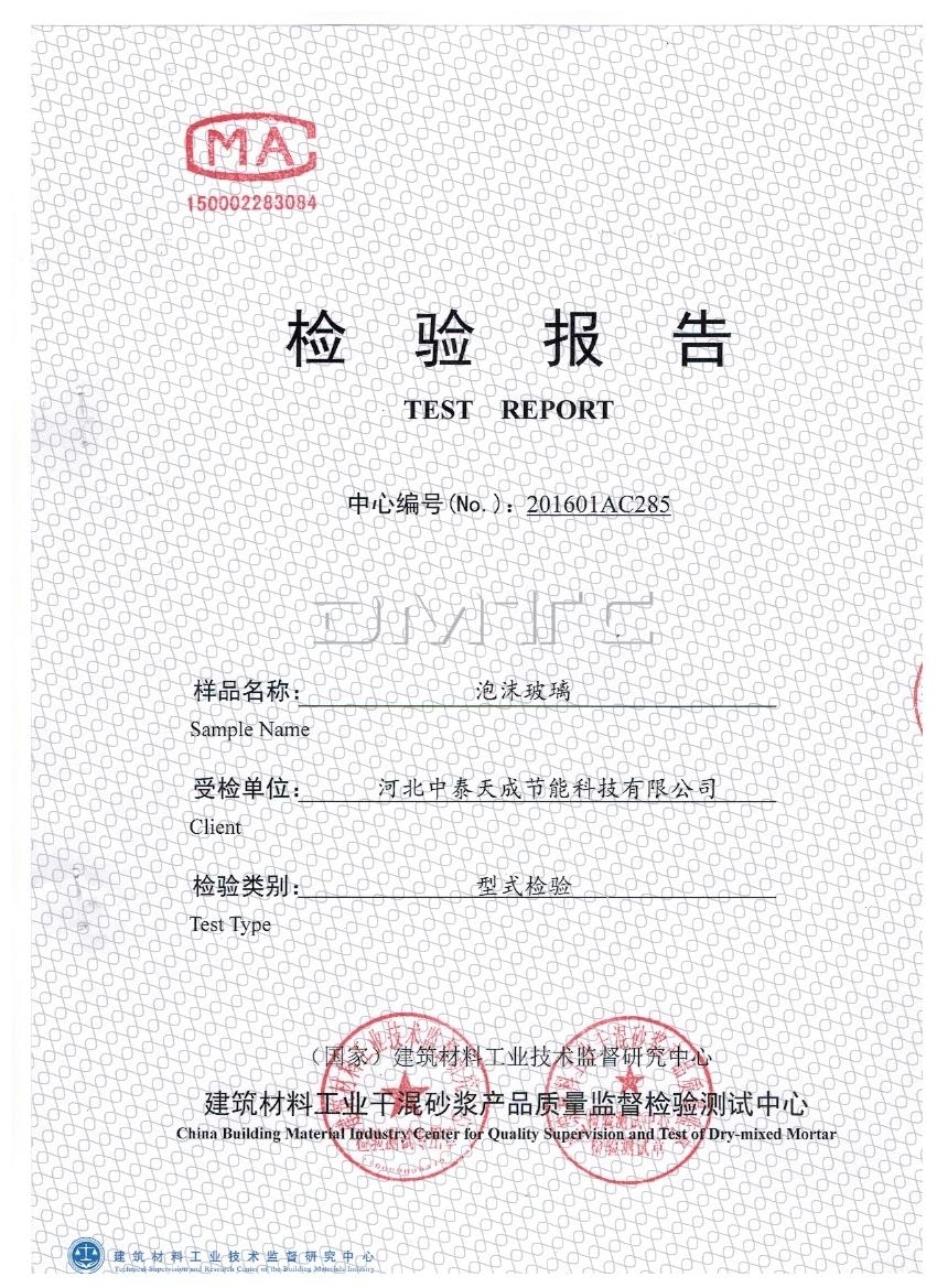 以上是它檢測的全項系數,泡沫玻璃板廠家告訴您一般做單項檢測的就是導熱系數,抗壓強度,這兩項,檢測依據泡沫玻璃板JC/T647-2014《泡沫玻璃絕熱制品》,防火等級區分依據的是GB8624-2012建筑材料及制品燃燒性能分級,如果您還有其它問題請聯系廠家河北中泰天成節能科技有限公司,咨詢電話:18003365866