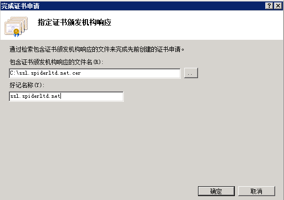 選擇 Verisign 頒發(fā)的服務(wù)器證書文件,并指定一個好記的名稱(可選),點(diǎn)擊確定